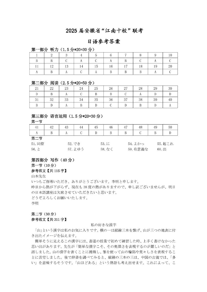 安徽省江南十校2025届高三3月联考 日语答案.pdf