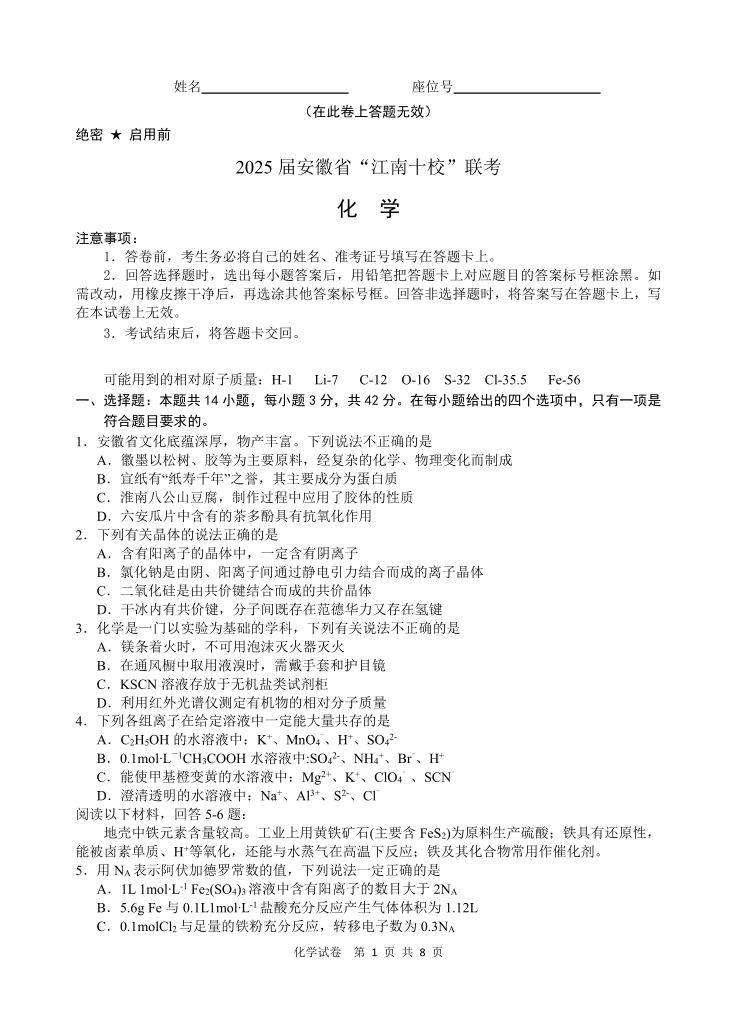 安徽省江南十校2025届高三3月联考 化学.pdf
