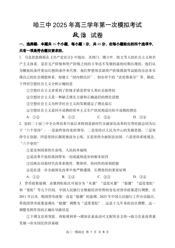 哈三中2025年高三学年第一次模拟考试 政治.pdf