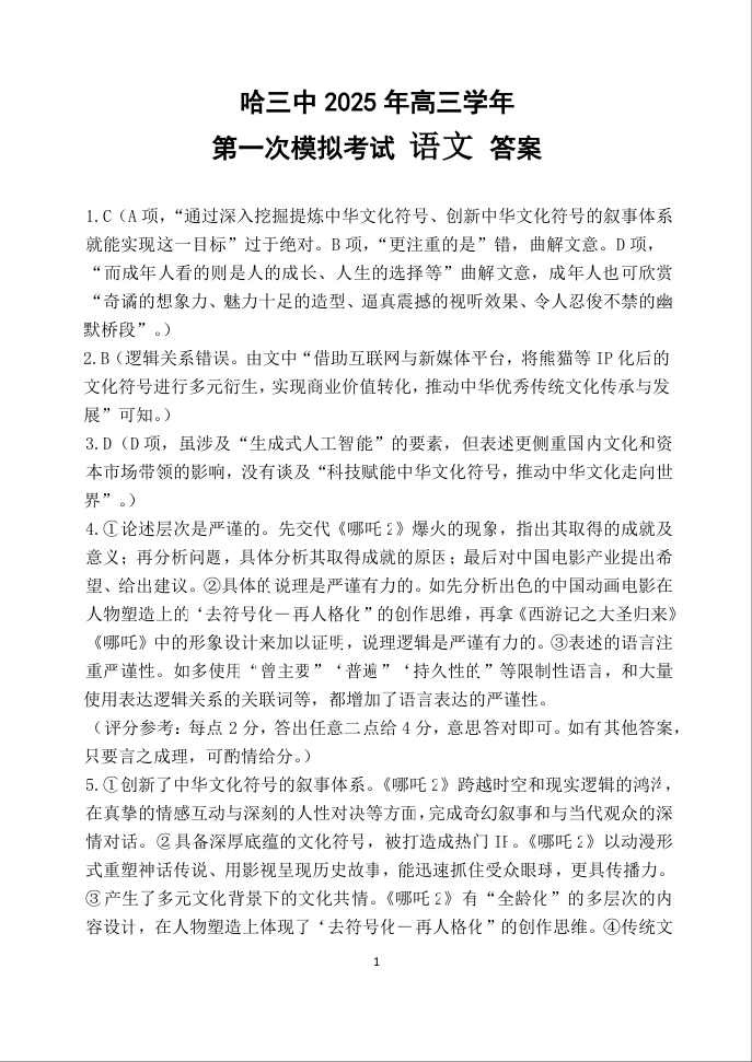 哈三中2025年高三学年第一次模拟考试 语文答案.docx