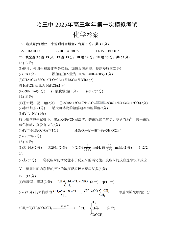 哈三中2025年高三学年第一次模拟考试 化学答案.docx