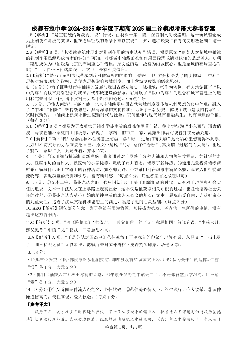 成都石室中学2024-2025学年度下期高2025届二诊模拟考试 语文答案.pdf
