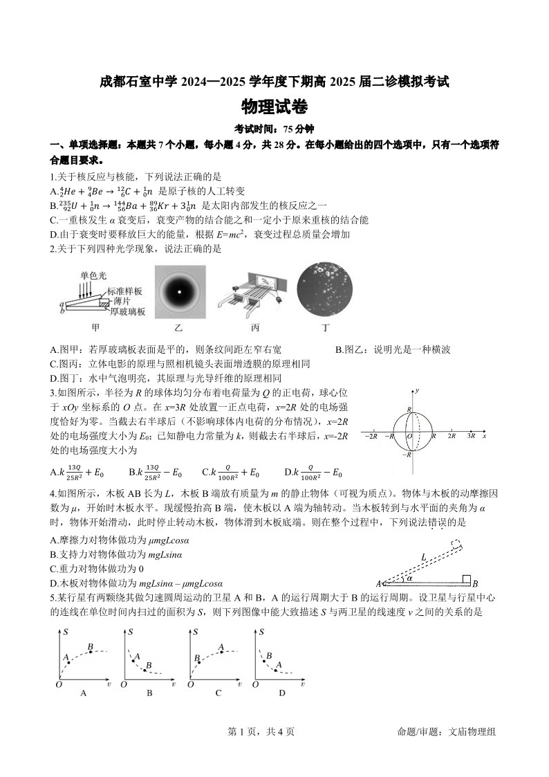 成都石室中学2024-2025学年度下期高2025届二诊模拟考试 物理.pdf