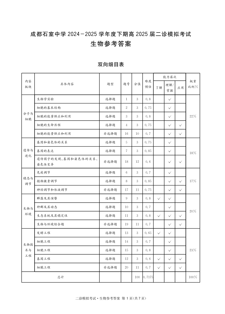 成都石室中学2024-2025学年度下期高2025届二诊模拟考试 生物答案.pdf