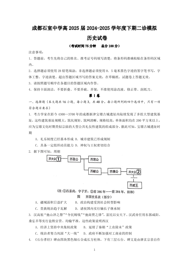 成都石室中学2024-2025学年度下期高2025届二诊模拟考试 历史.pdf