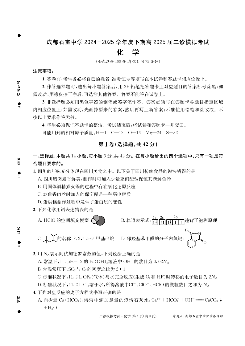 成都石室中学2024-2025学年度下期高2025届二诊模拟考试 化学.pdf