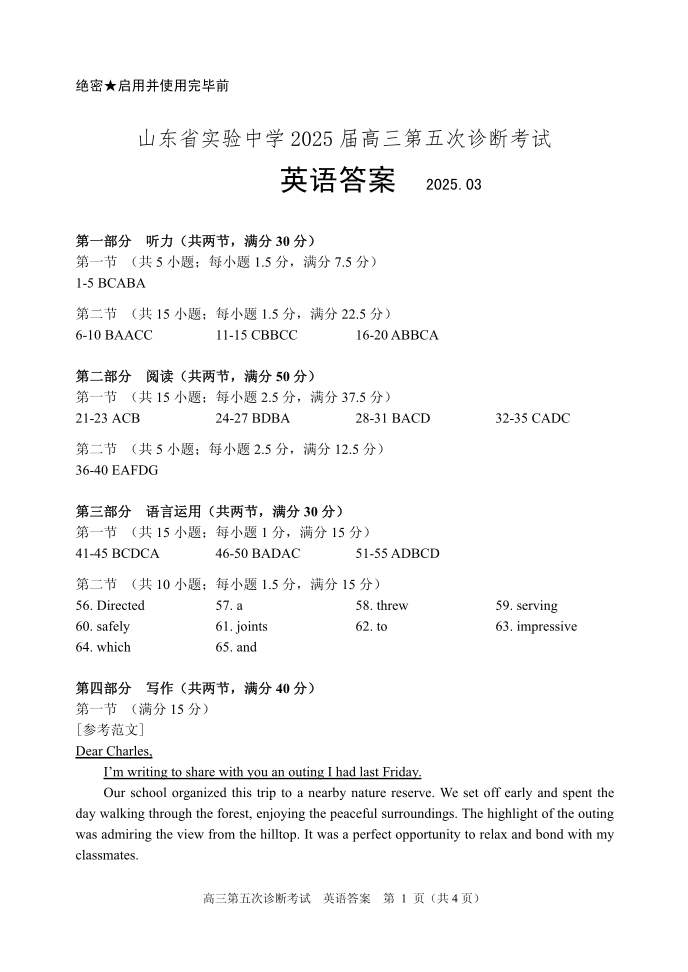 山东省实验中学2025届高三第五次诊断考试 英语答案.pdf
