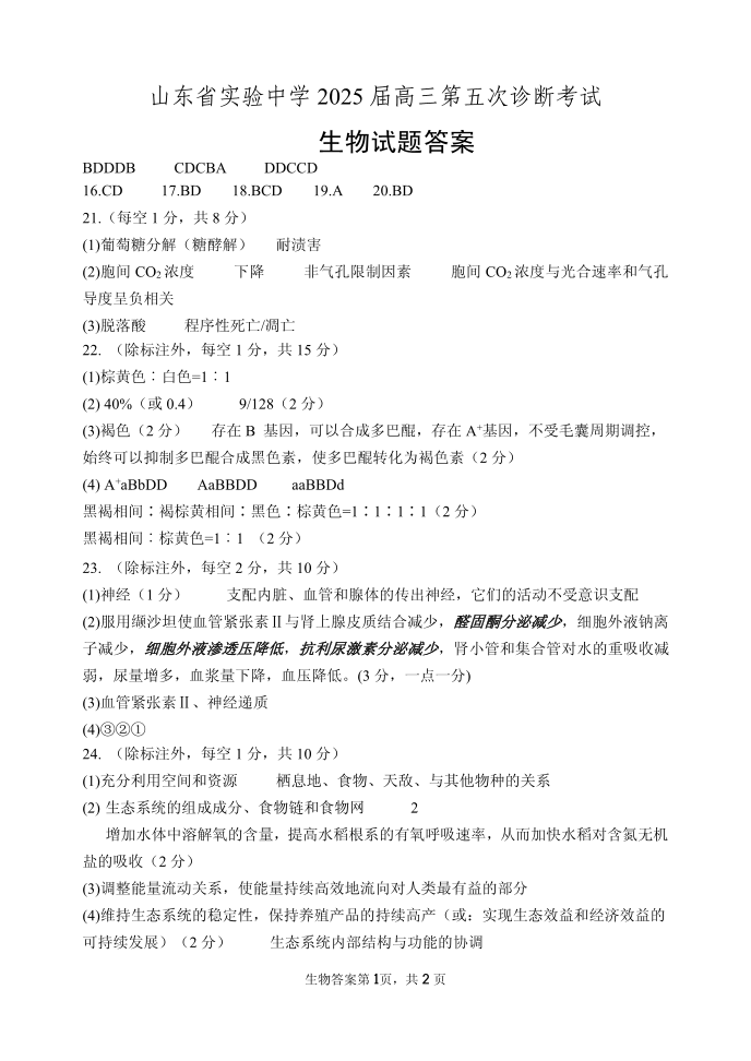 山东省实验中学2025届高三第五次诊断考试 生物答案.pdf