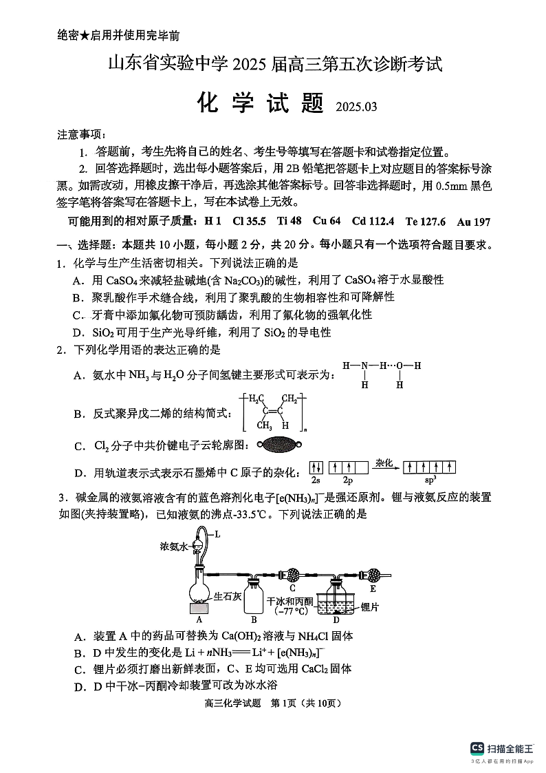 山东省实验中学2025届高三第五次诊断考试 化学.pdf