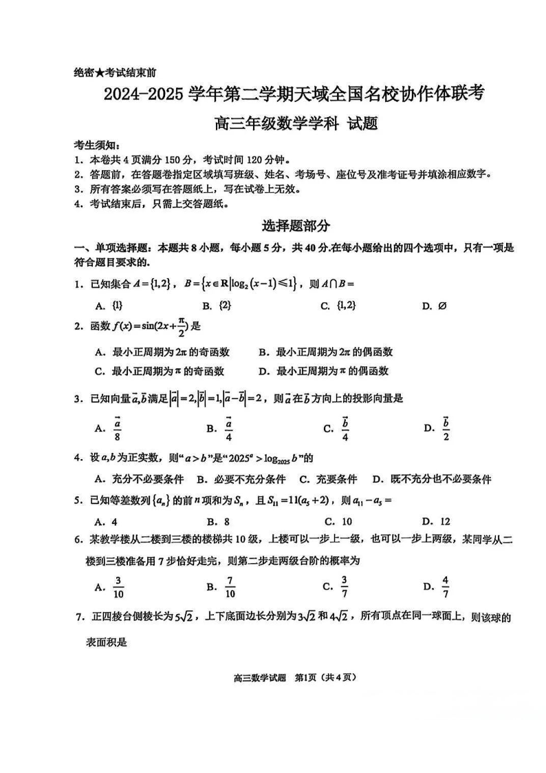 2024-2025学年第二学期天域全国名校协作体高三3月联考 数学.pdf
