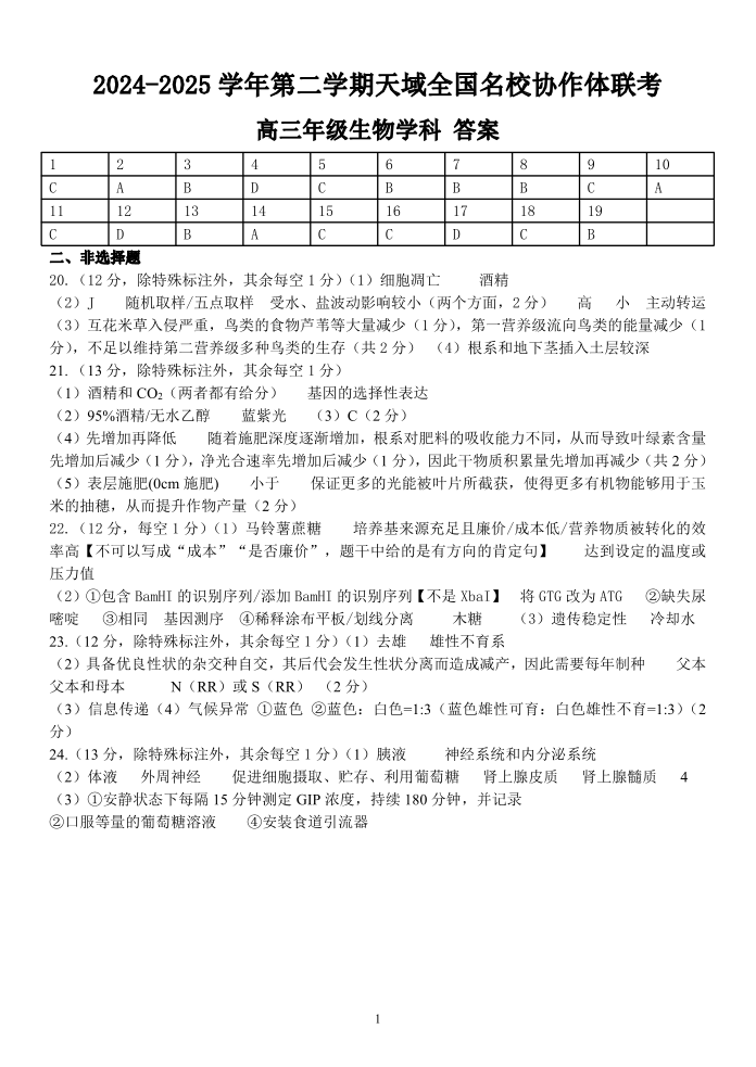 2024-2025学年第二学期天域全国名校协作体高三3月联考 生物答案.pdf