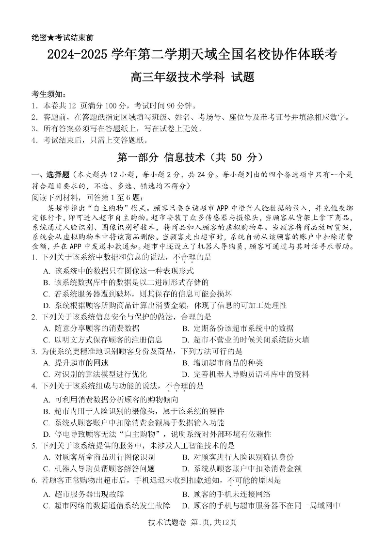 2024-2025学年第二学期天域全国名校协作体高三3月联考 技术.pdf