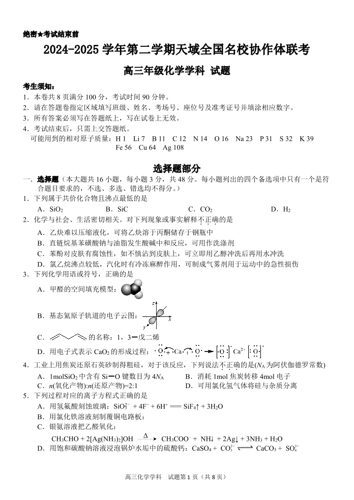 2024-2025学年第二学期天域全国名校协作体高三3月联考 化学.pdf