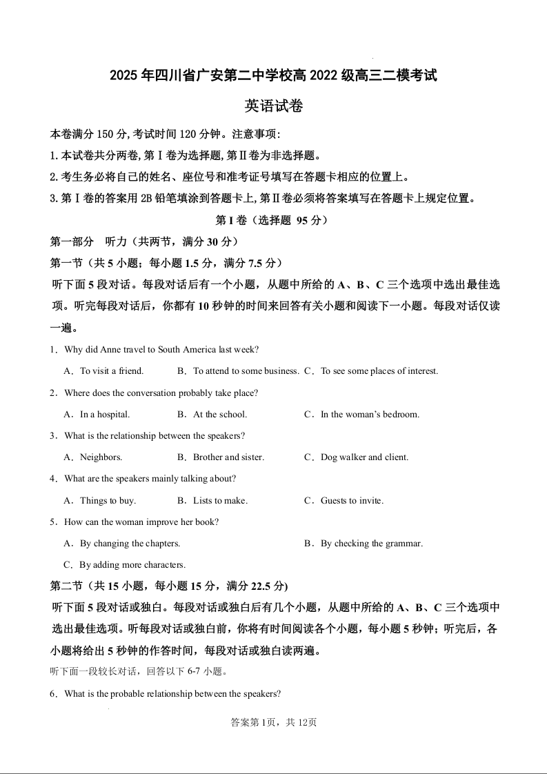四川省广安第二中学校2025届高三下学期二模 英语.docx