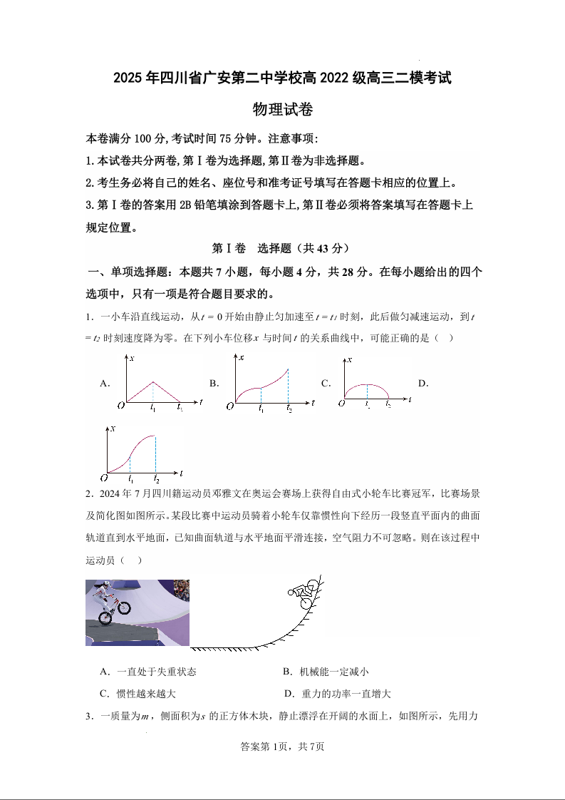四川省广安第二中学校2025届高三下学期二模 物理.docx