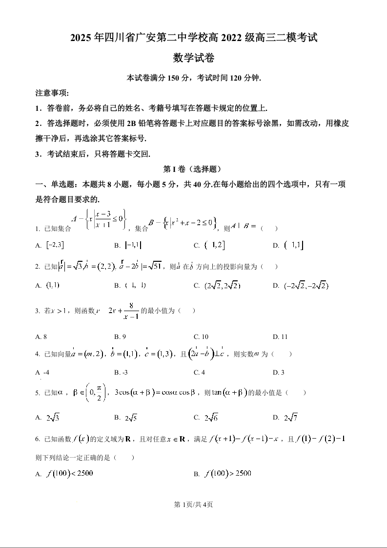 四川省广安第二中学校2025届高三下学期二模 数学.docx