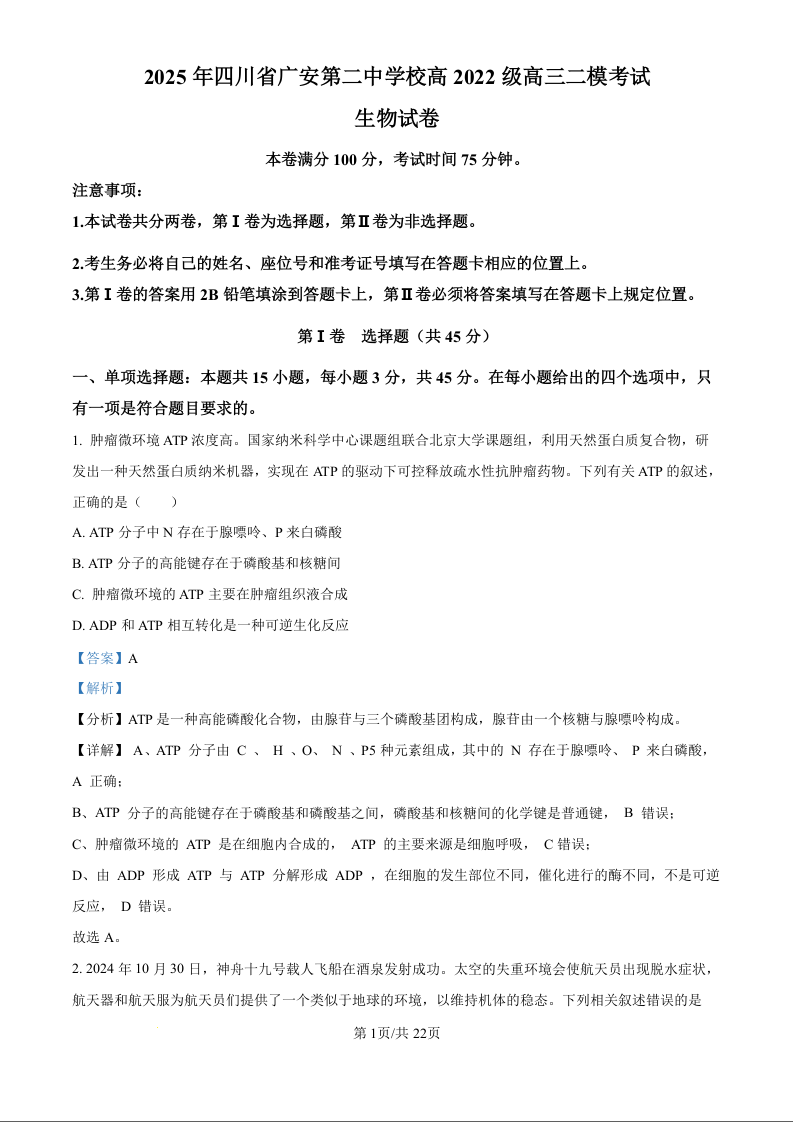 四川省广安第二中学校2025届高三下学期二模 生物答案.docx
