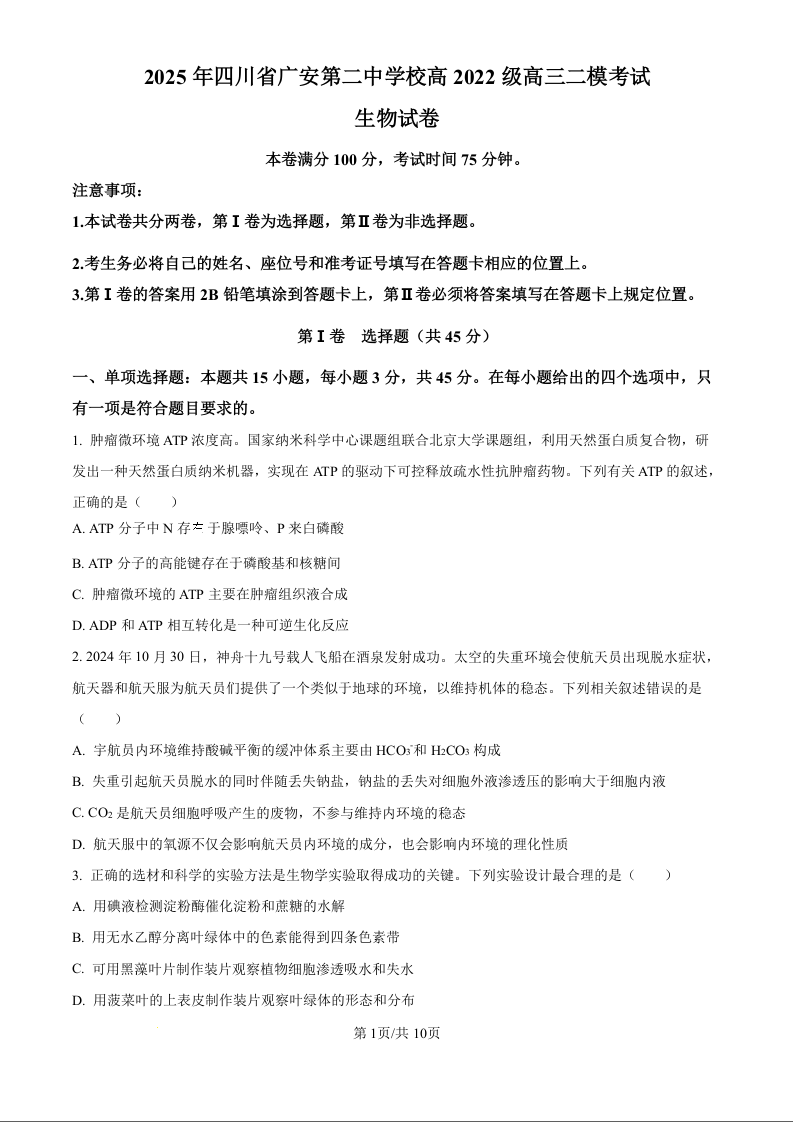 四川省广安第二中学校2025届高三下学期二模 生物.docx