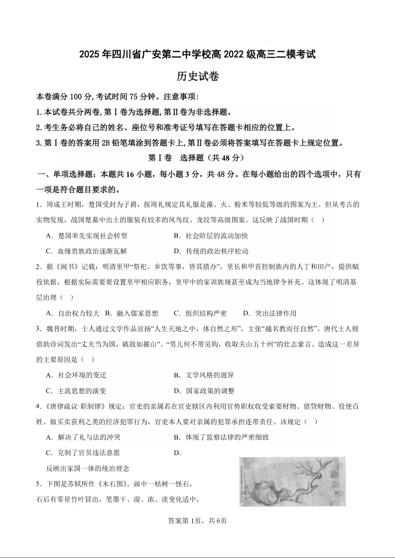 四川省广安第二中学校2025届高三下学期二模 历史.docx