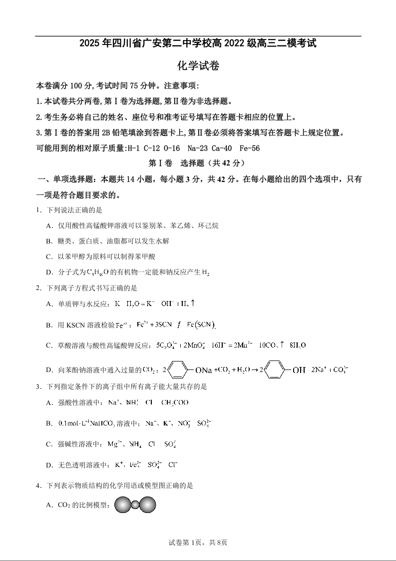 四川省广安第二中学校2025届高三下学期二模 化学.docx