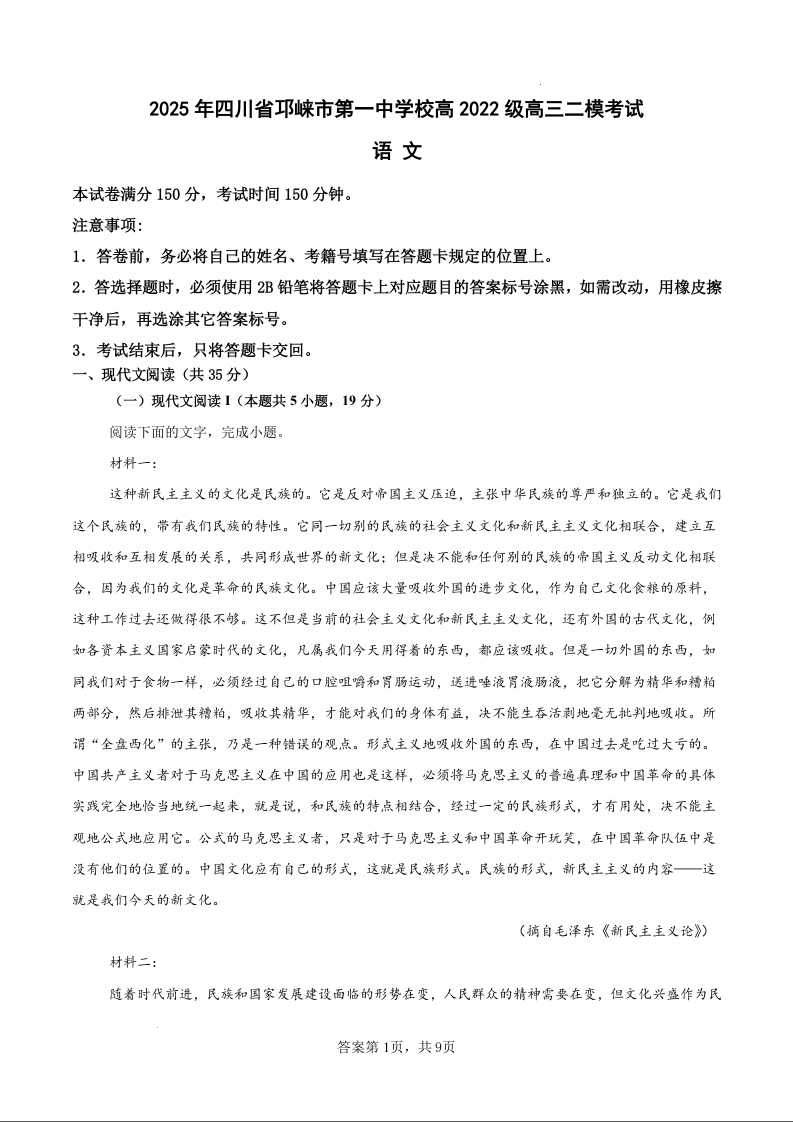 四川省成都市邛崃市第一中学校2025届高三下学期二模 语文.docx