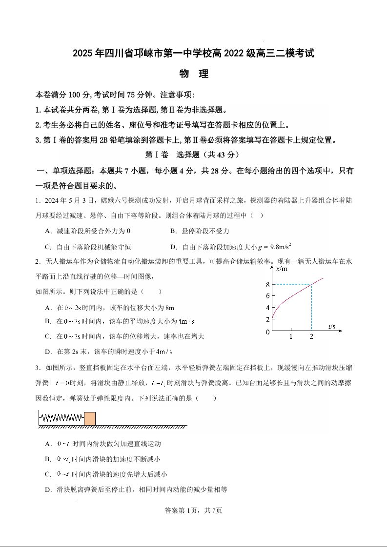 四川省成都市邛崃市第一中学校2025届高三下学期二模 物理.docx