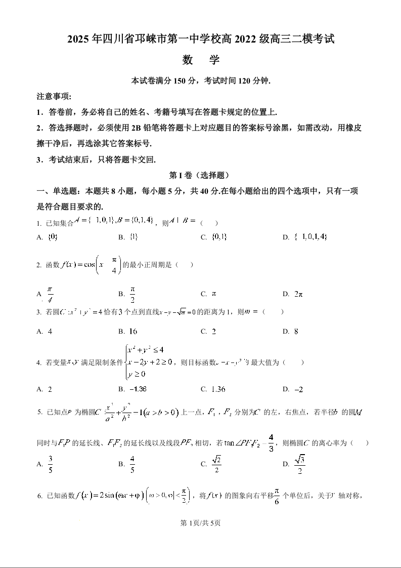 四川省成都市邛崃市第一中学校2025届高三下学期二模 数学.docx