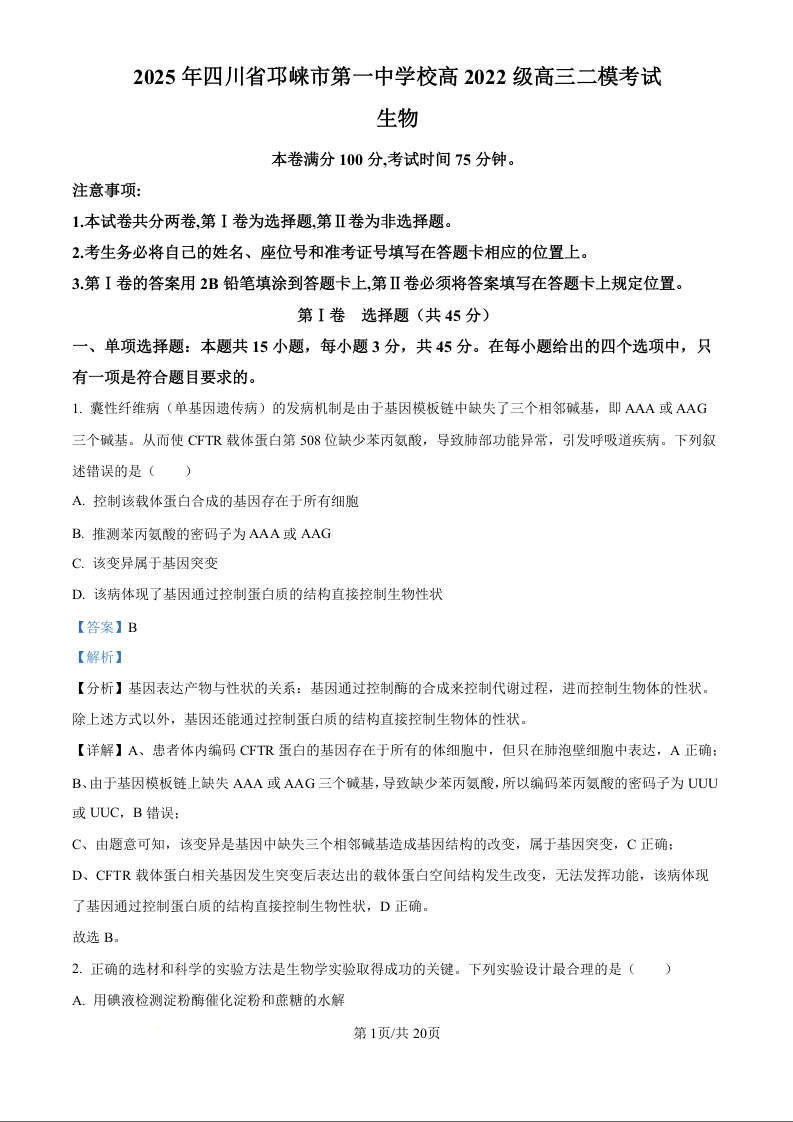 四川省成都市邛崃市第一中学校2025届高三下学期二模 生物答案.docx