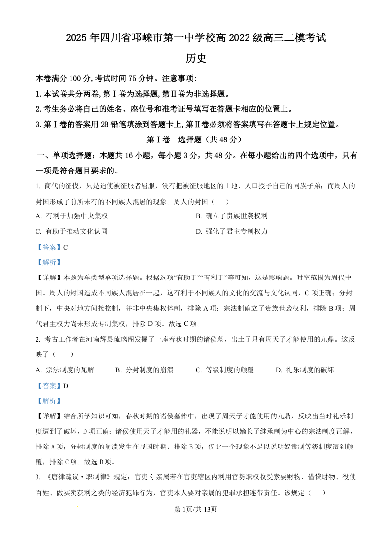 四川省成都市邛崃市第一中学校2025届高三下学期二模 历史答案.docx