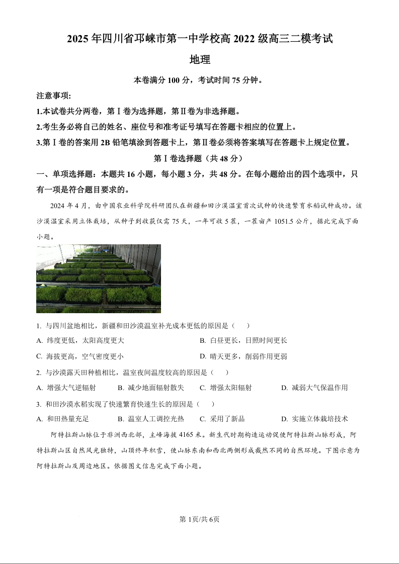 四川省成都市邛崃市第一中学校2025届高三下学期二模 地理.docx