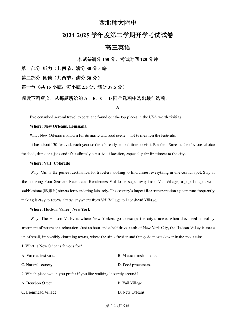 西北师大附中2025届第二学期开学考试 英语.docx
