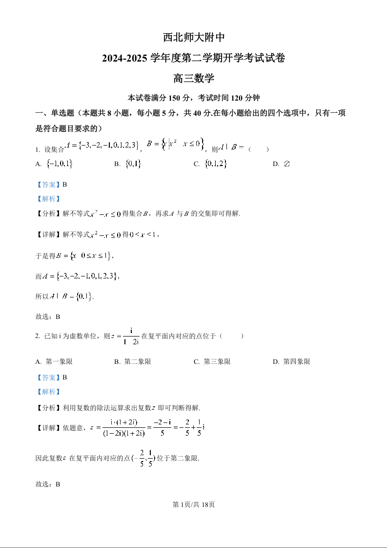 西北师大附中2025届第二学期开学考试 数学答案.docx