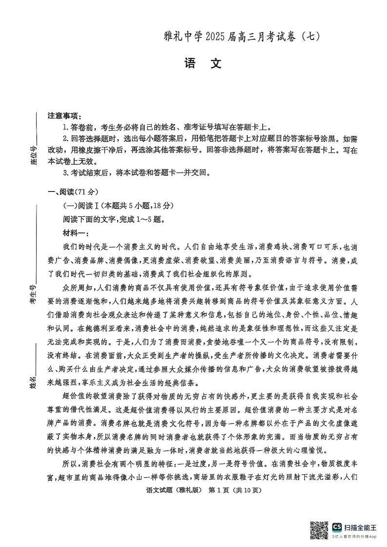 湖南省长沙市雅礼中学2025届高三月考试卷(七)语文.pdf