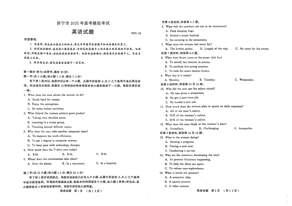 山东省济宁市2025年高考模拟考试(一模)英语.pdf