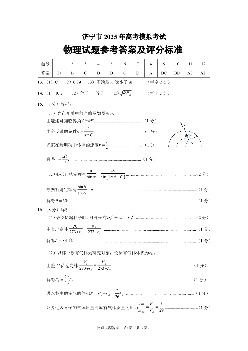 山东省济宁市2025年高考模拟考试(一模)物理答案.pdf