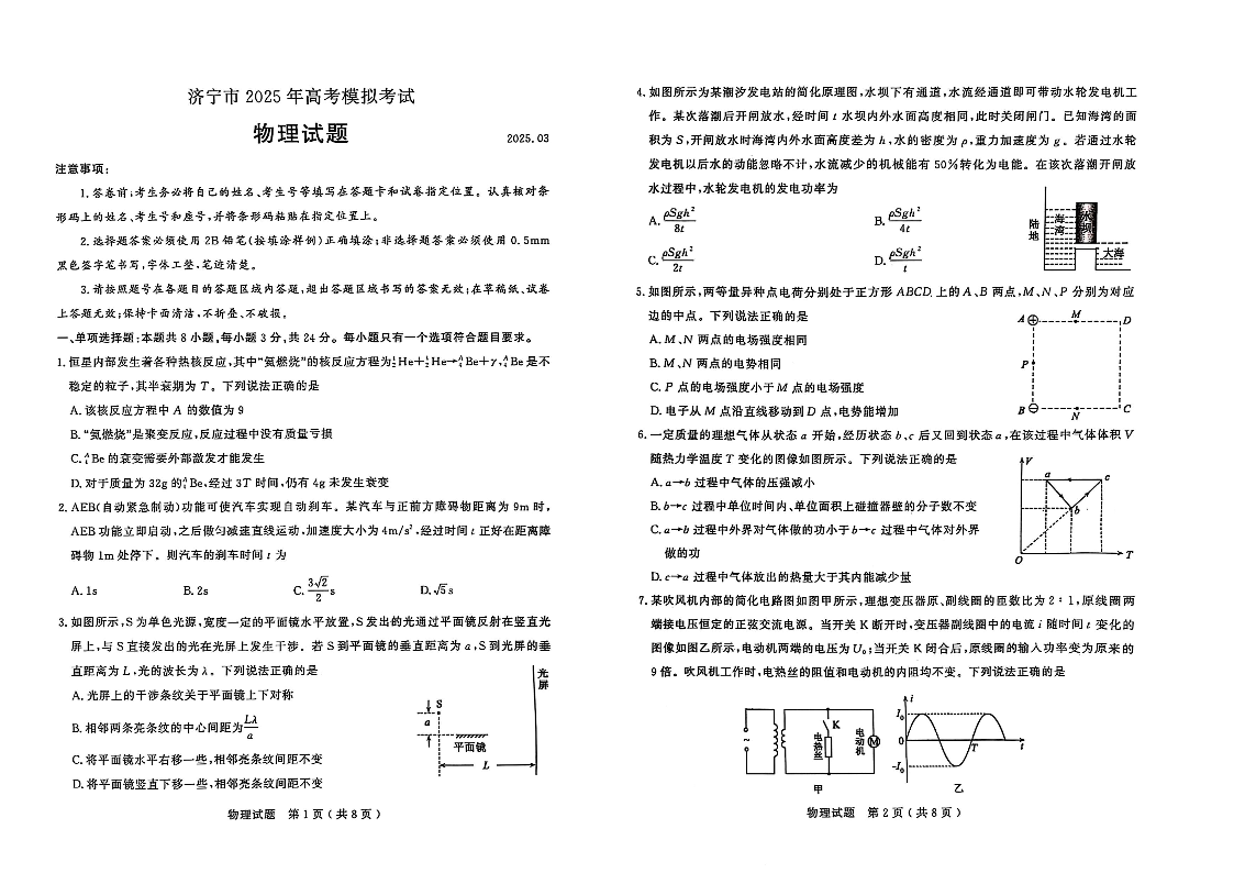 山东省济宁市2025年高考模拟考试(一模)物理.pdf
