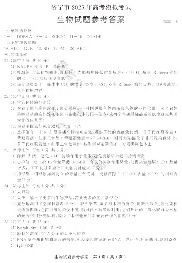 山东省济宁市2025年高考模拟考试(一模)生物答案.pdf