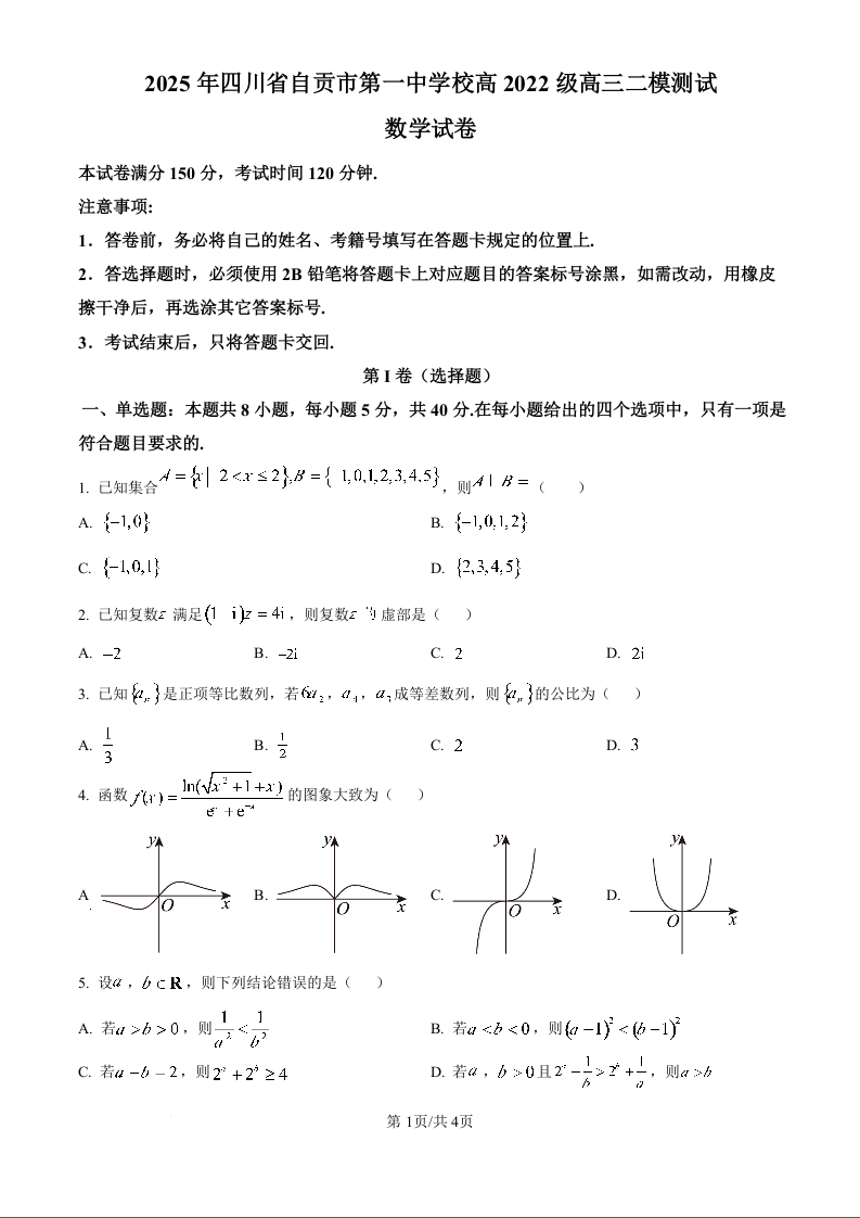 四川省自贡市第一中学2025届高三下学期二模 数学.docx