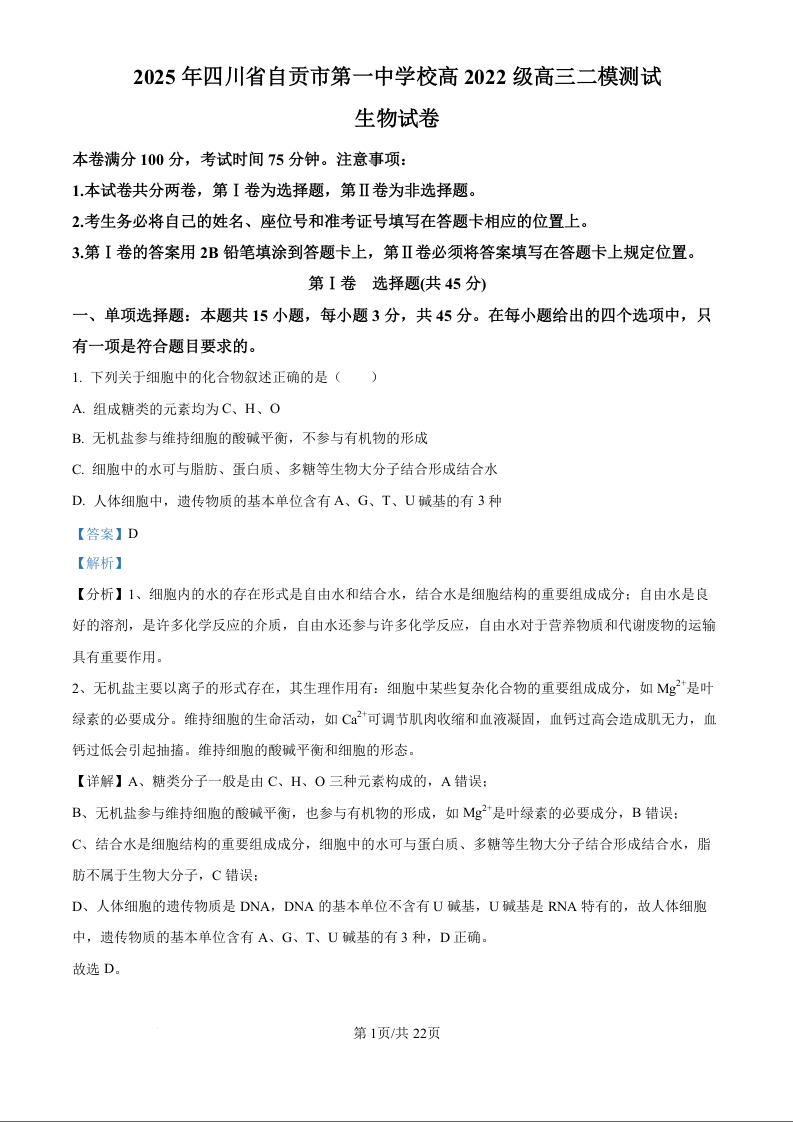 四川省自贡市第一中学2025届高三下学期二模 生物答案.docx