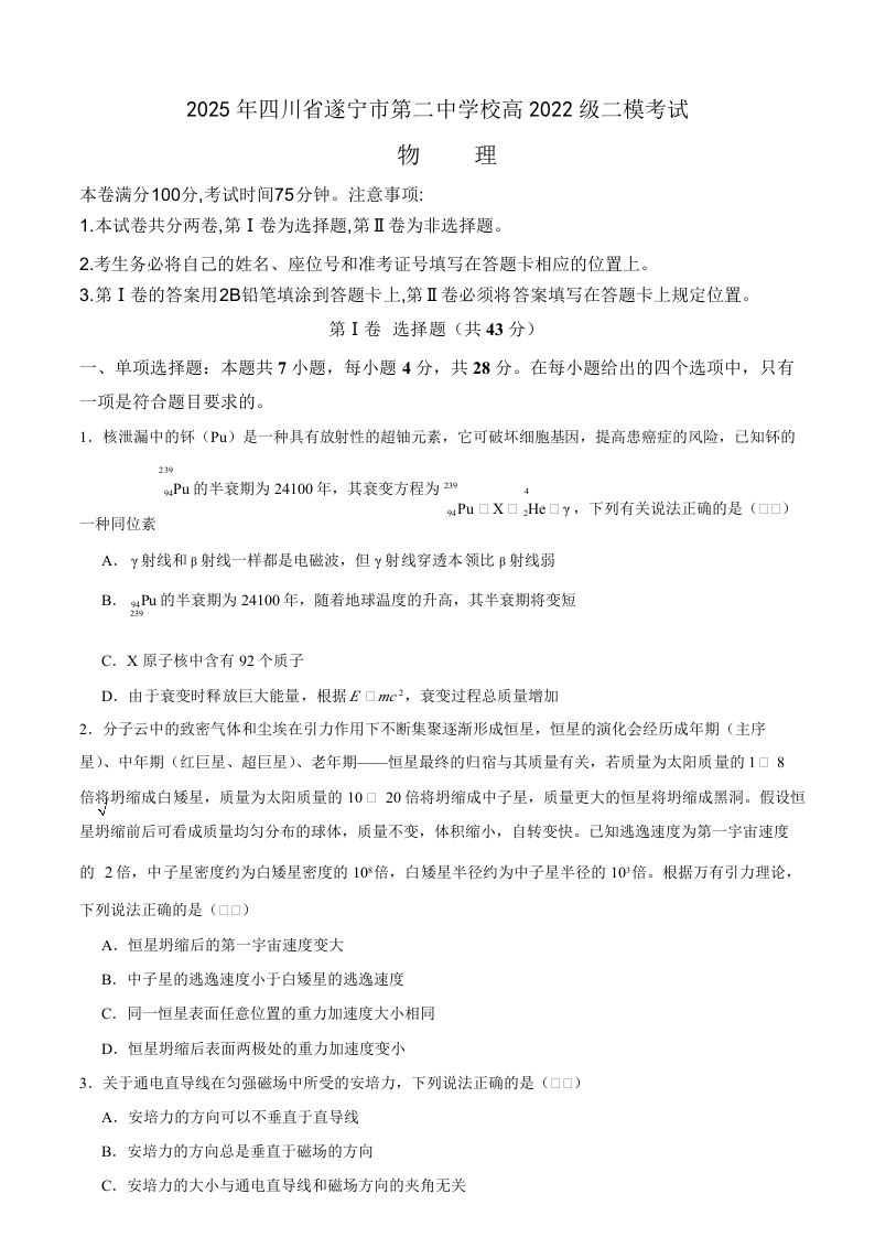 四川省遂宁市第二中学校高2022级二模考试 物理(含答案).docx