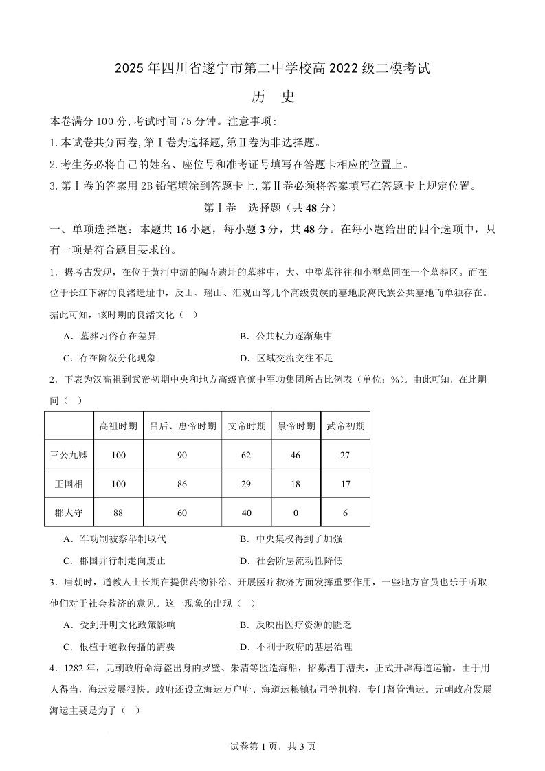 四川省遂宁市第二中学校高2022级二模考试 历史(含答案).docx