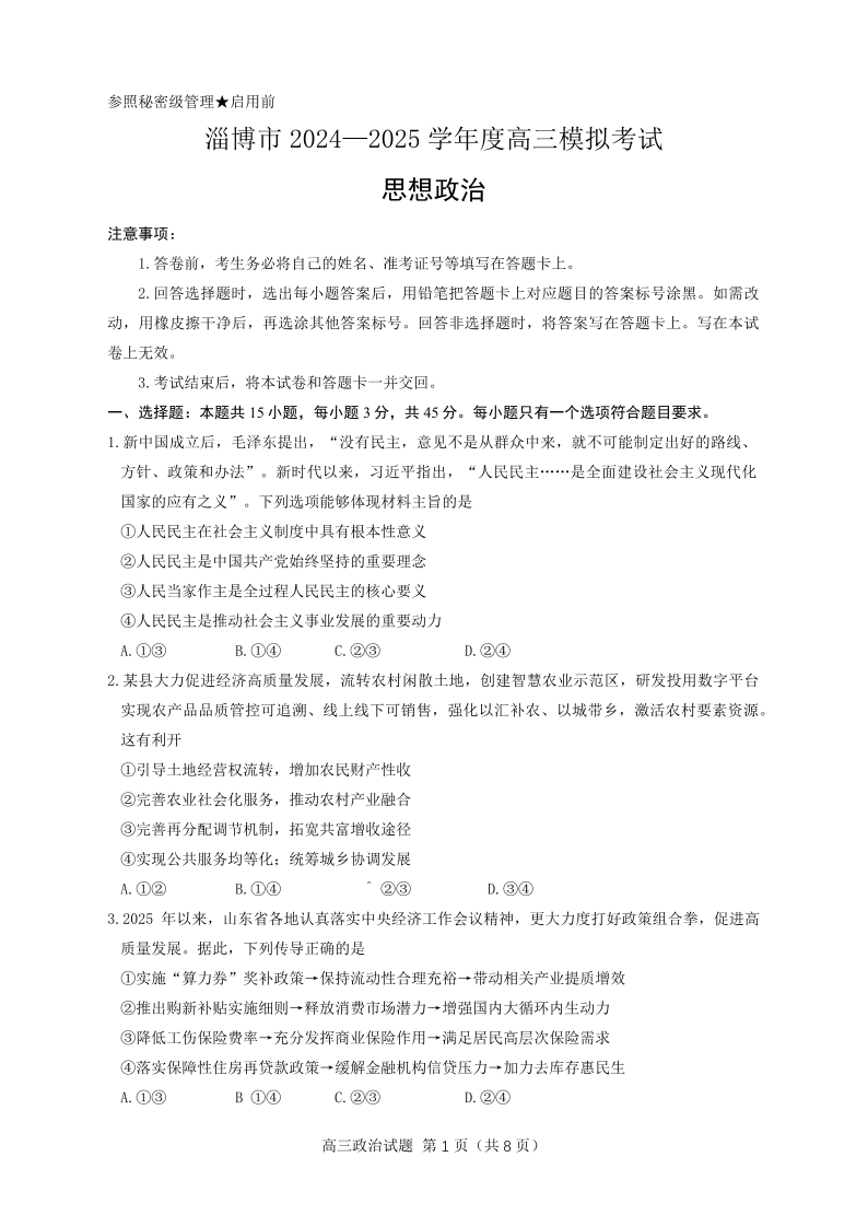 山东省淄博市2025届高三3月模拟考试 政治.pdf