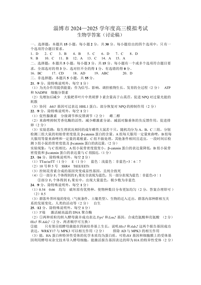 山东省淄博市2025届高三3月模拟考试 生物答案.docx