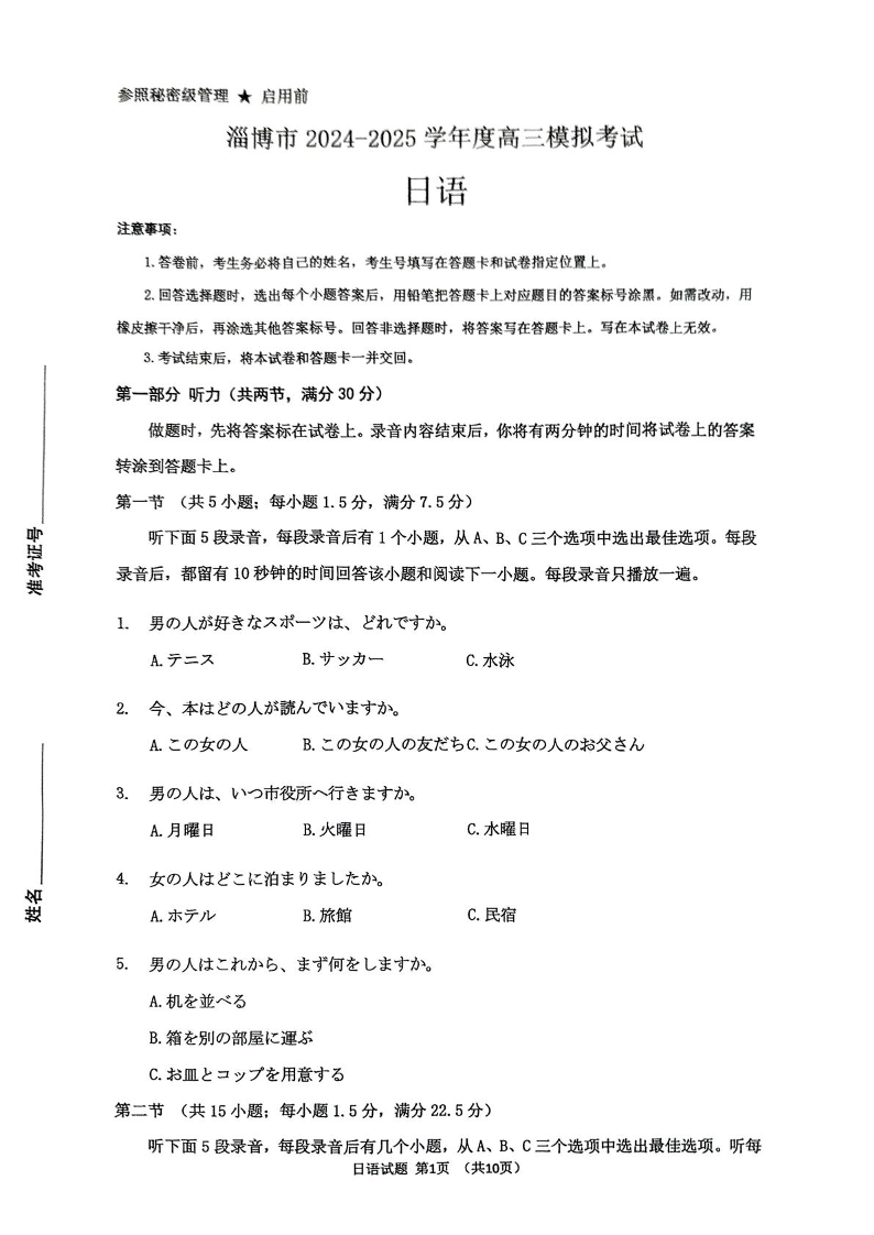 山东省淄博市2025届高三3月模拟考试 日语(含答案).pdf