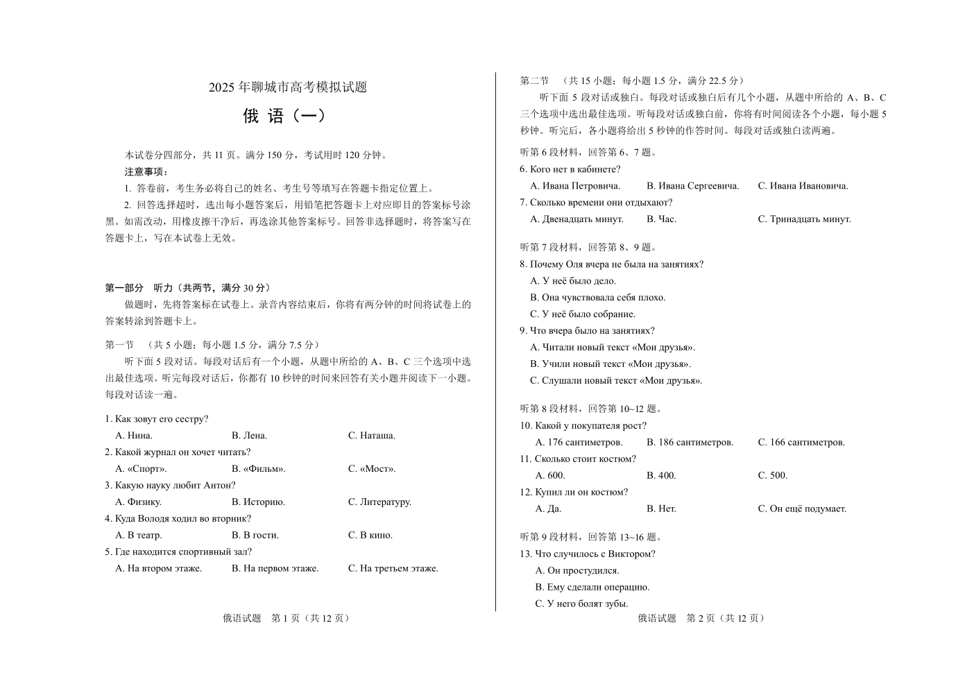 山东省2025年聊城市高考模拟考试(一)俄语.pdf