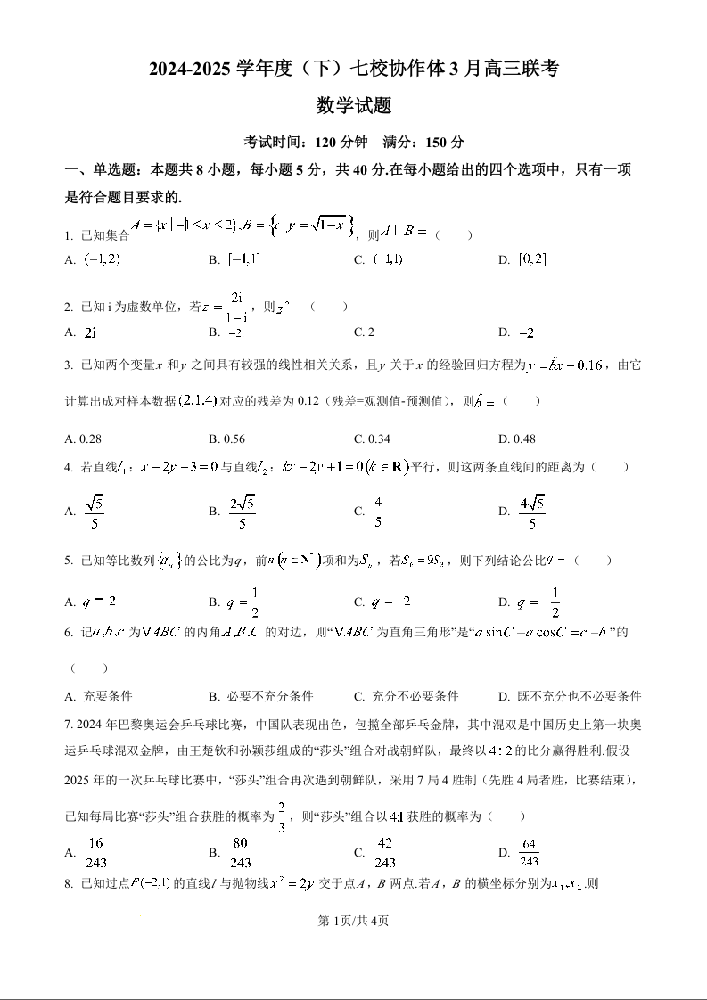 辽宁省七校协作体2024-2025学年度(下)3月高三联考 数学.docx