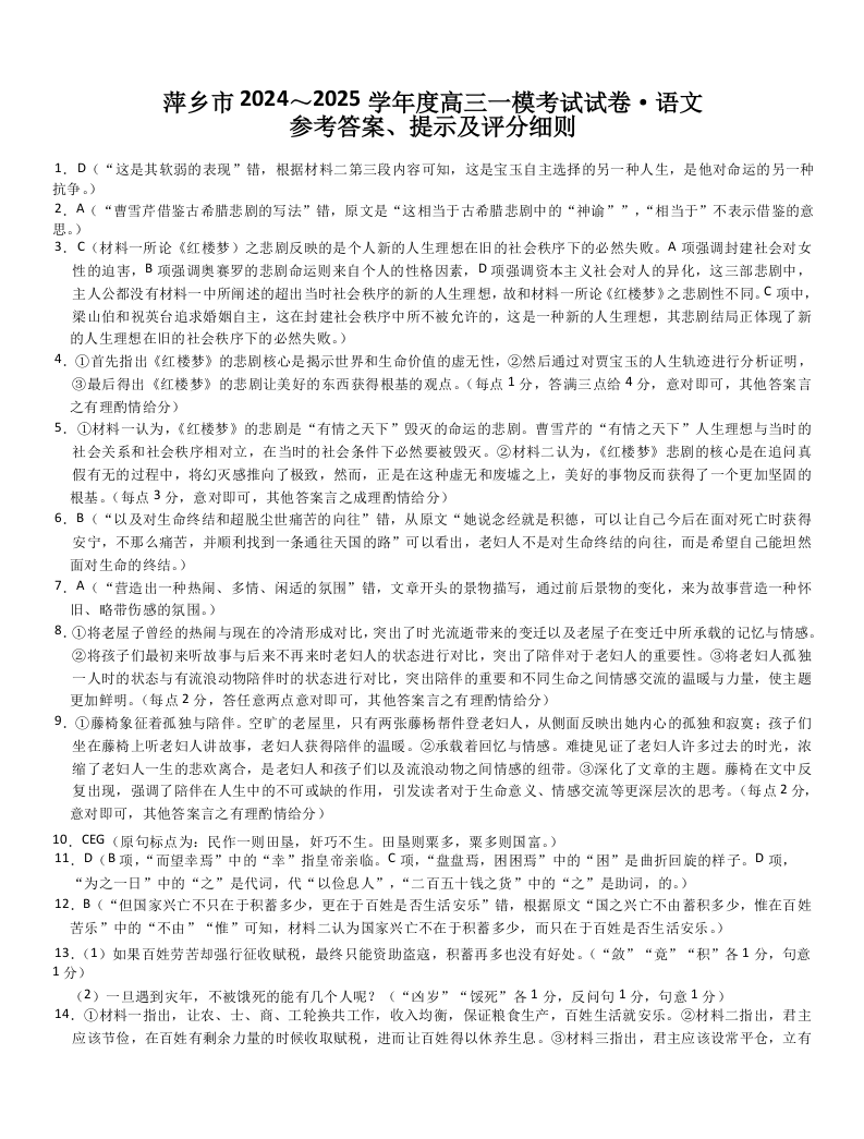 江西省萍乡市2025届高三下学期一模考试 语文答案.docx