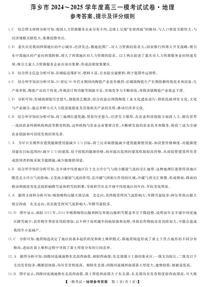 江西省萍乡市2025届高三下学期一模考试 地理答案.pdf
