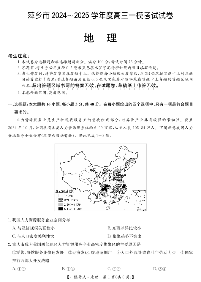 江西省萍乡市2025届高三下学期一模考试 地理.pdf