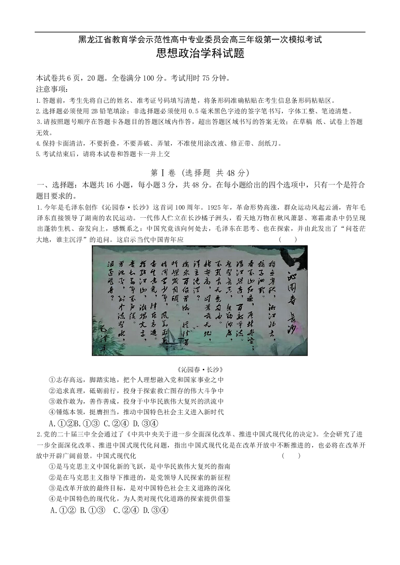 黑龙江省教育学会示范性高中专业委员会2025届高三下学期第一次模拟 政治.docx